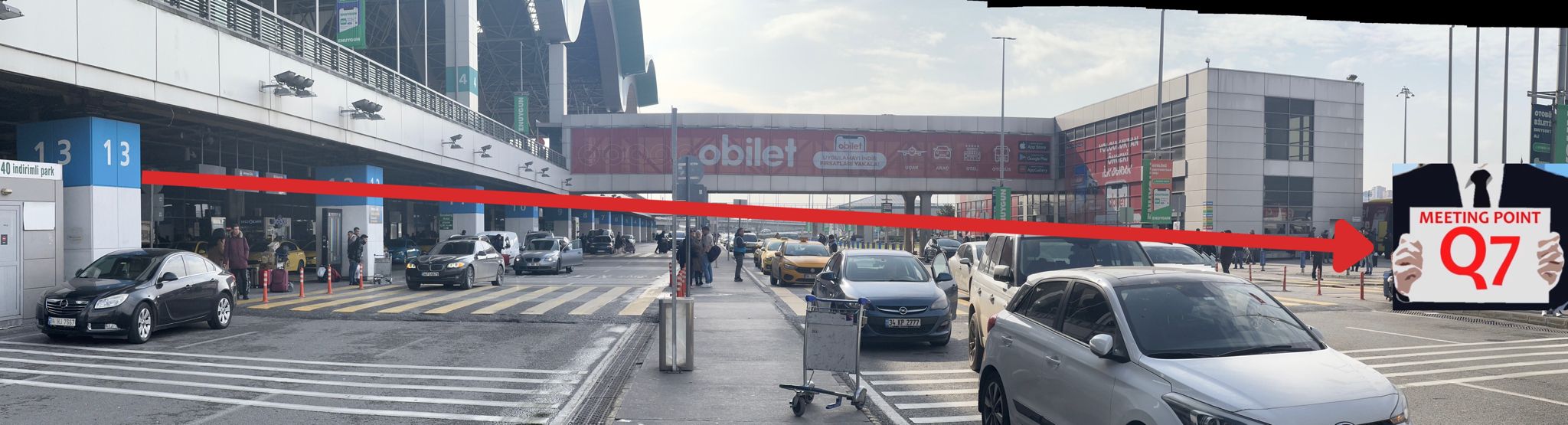 For all domestic and international flights, the welcoming process is carried out in front of the exit gate on the arrival floor of the terminal.After exiting the airport through the arrival gate, turn right. Walk approximately 30–40 meters, and you will see Column 13 on your left. Walk towards it and turn left. Cross the road. You will see Simit Sarayı in front of you. In front of Simit Sarayı, there is an area where the welcome signs are displayed. Go to that area and look for the “Q7” sign. Tell them your first and last name — our welcoming team will assist you